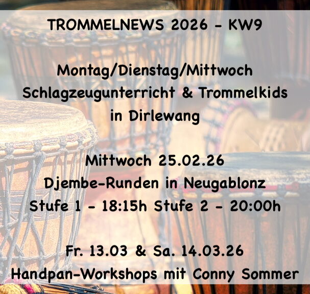 Mittwoch Djembe-Trommelrunden – 14-tägig Stufe 1: Mittwoch 18:15h bis 19:45h Stufe 2: Mittwoch 20:00h bis 21:30h in Neugablonz Block A-26: Termine bis Ostern 26 25.2. / 11.3. / 25.3. -> Ferien