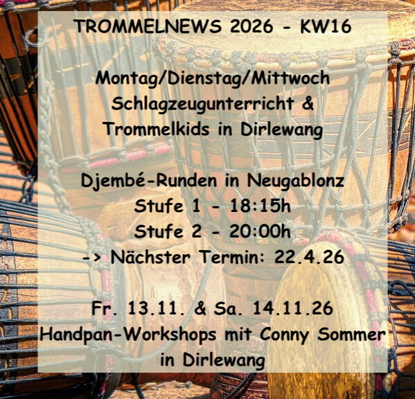 Mittwoch Djembe-Trommelrunden – 14-tägig Stufe 1: Mittwoch 18:15h bis 19:45h Stufe 2: Mittwoch 20:00h bis 21:30h in Neugablonz Block A-26: Termine bis Ostern 26 11.3. / 25.3. -> Ferien