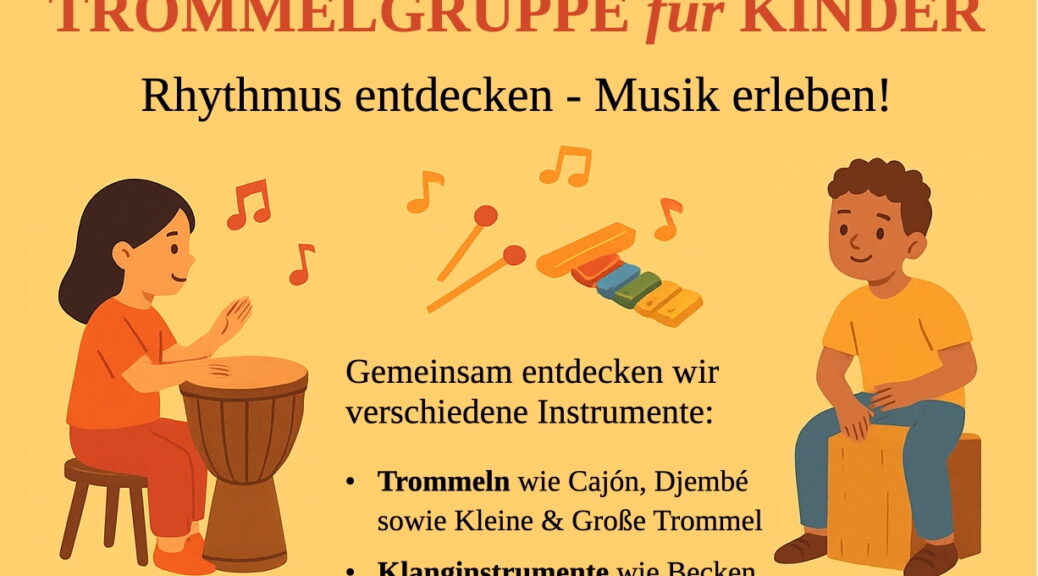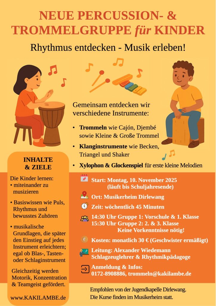 Cajon, Rhythmik, Trommeln, Unterricht, Workshops NEUES ANGEBOT für KIDS in Dirlewang 26. Oktober 2025 Alexander Wiedemann Zwei Percussion- und Trommel-Gruppen:– Vorschulkinder und 1. Klasse– Kinder der 2. und 3. KlasseImmer Montag Nachmittag im Musikerheim DirlewangLos geht’s nach den Herbstferien